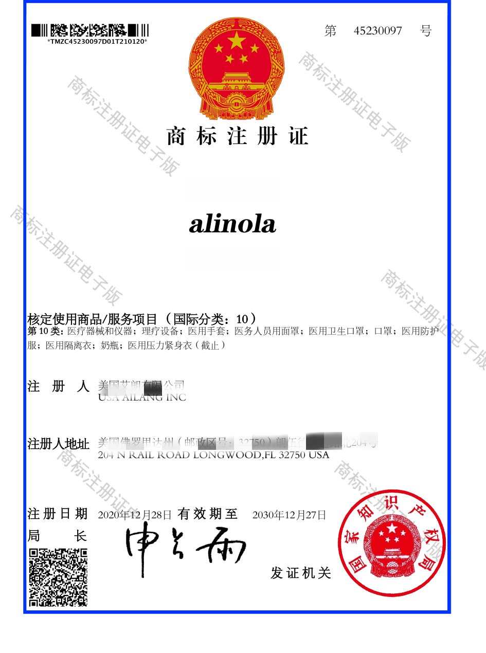 第10类“ALINOLA”商标注册证