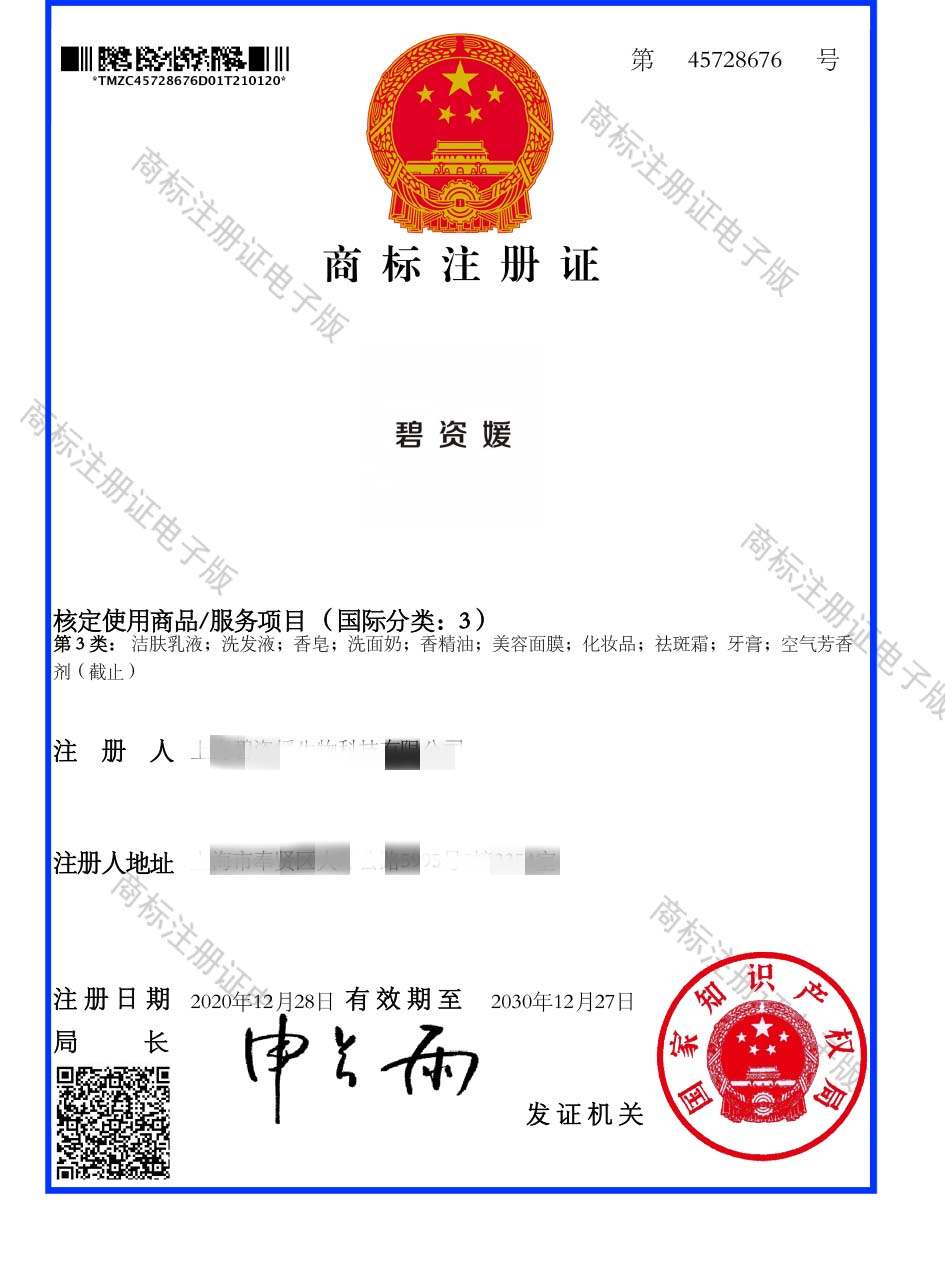 第3类“碧资媛”商标注册证