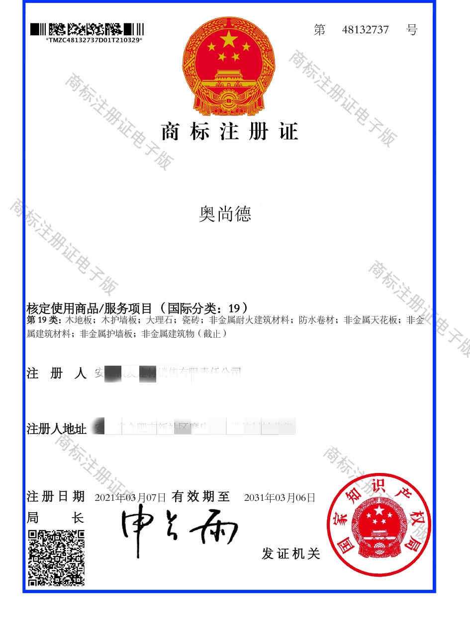 第19类“奥尚德”商标注册证