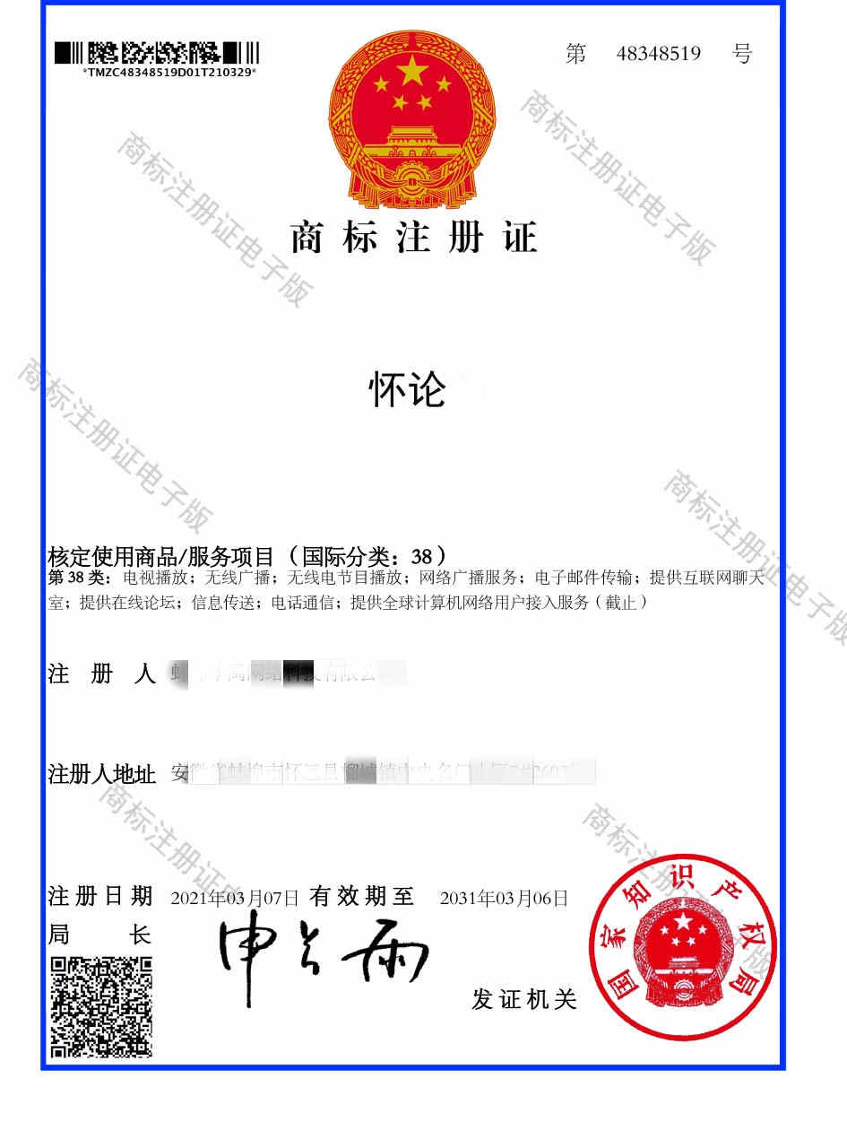 第38类“怀论”商标注册证