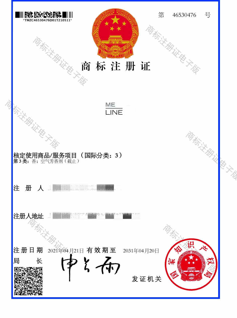 第3类“ME LINE”商标注册证