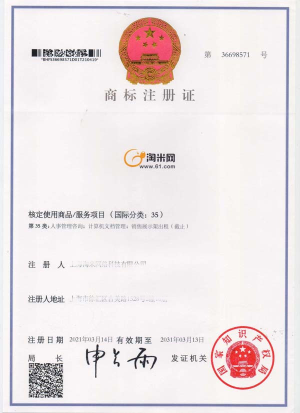 第35类“淘米网”商标注册证