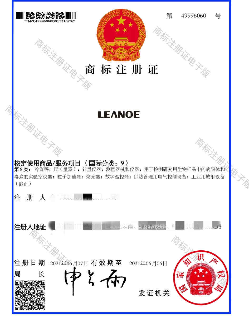 第9类“LEANQE”商标注册证