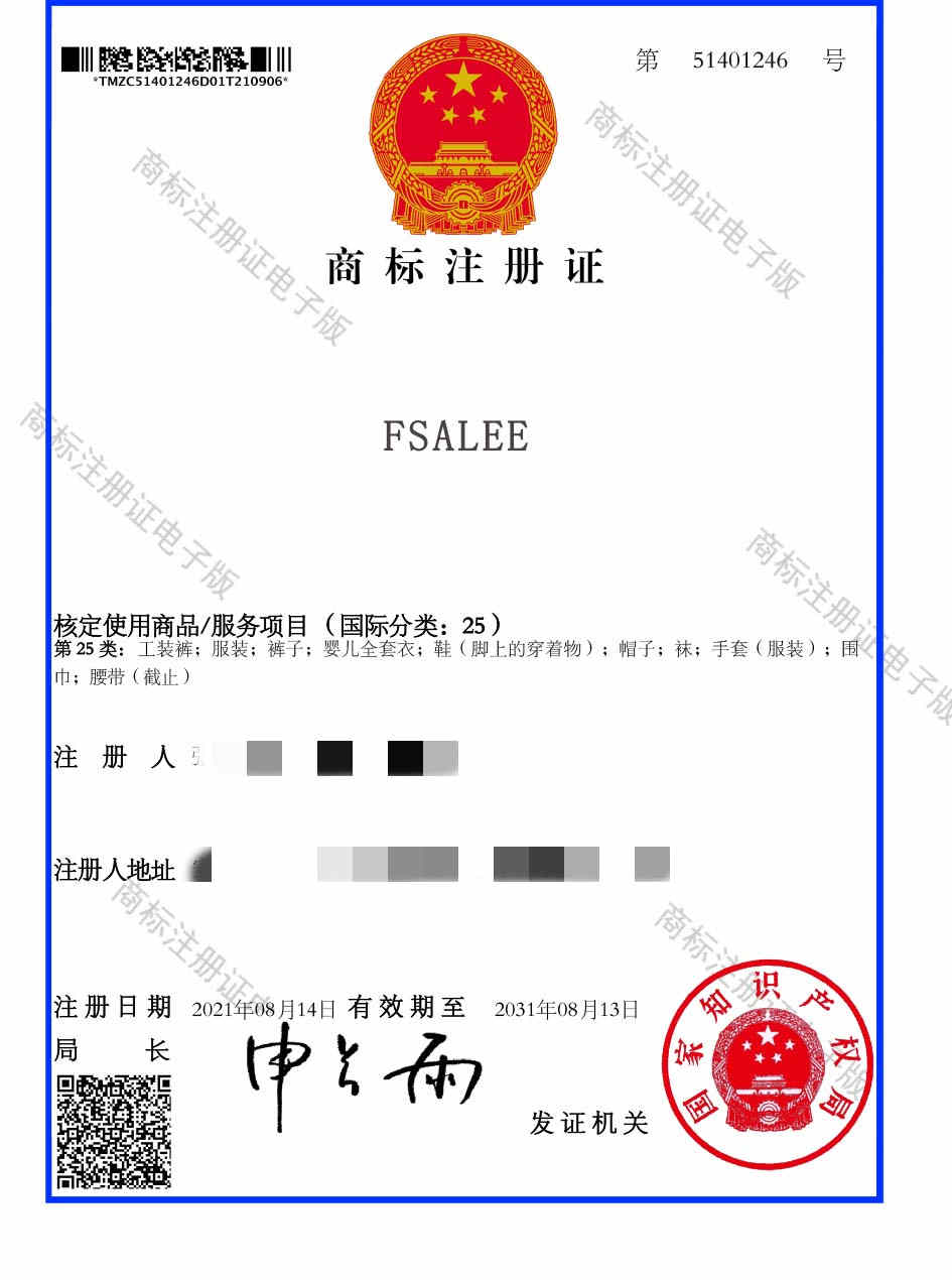 第25类“FSALEE”商标注册证