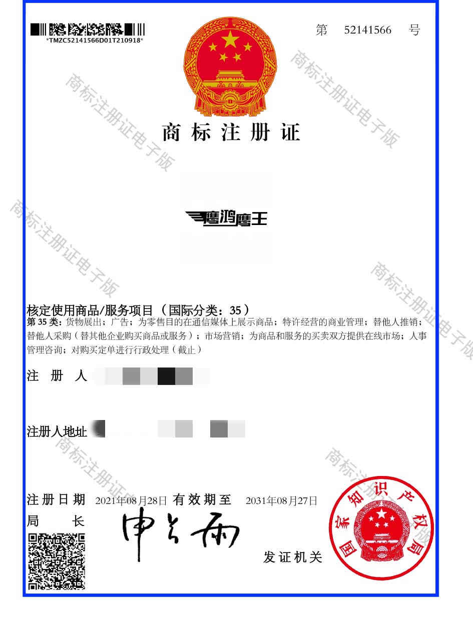 第35类“鹰鸿鹰王”商标注册证