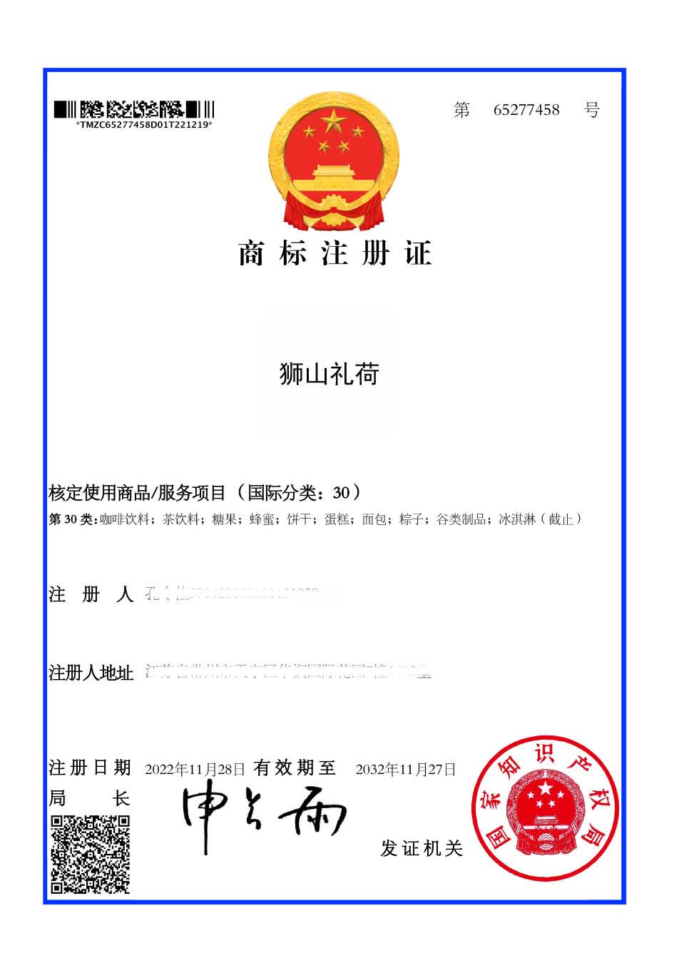 第30类“狮山礼荷”商标注册证