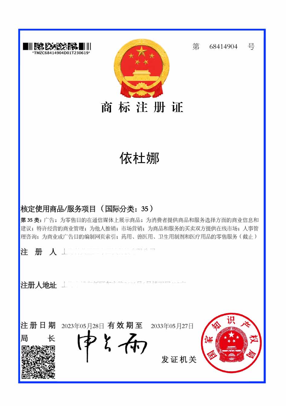 第35类“依杜娜”商标注册证