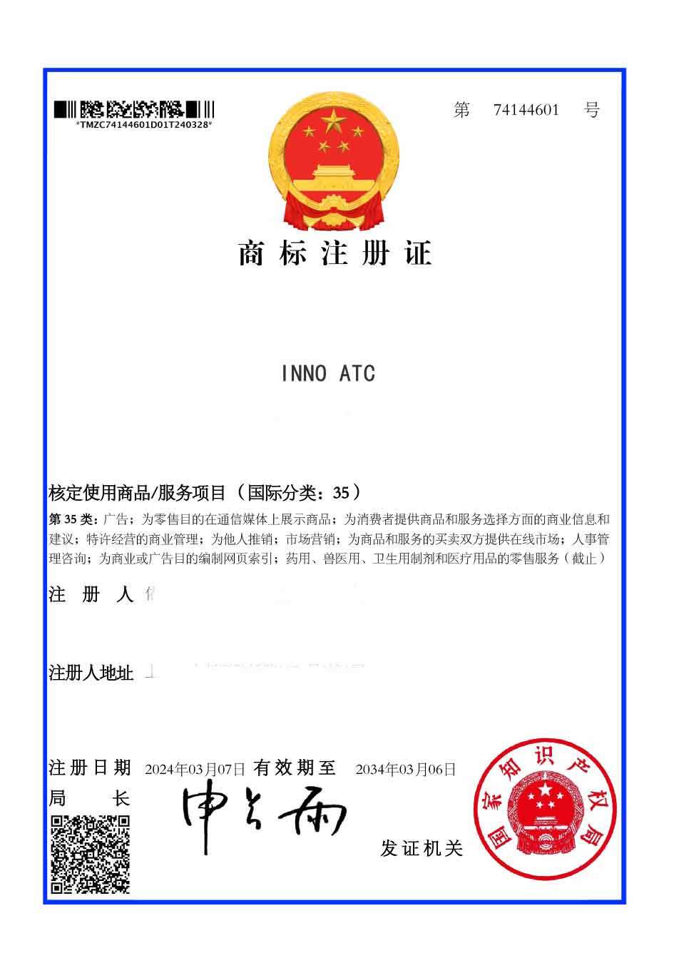 第35类“INNO ATC”商标注册证