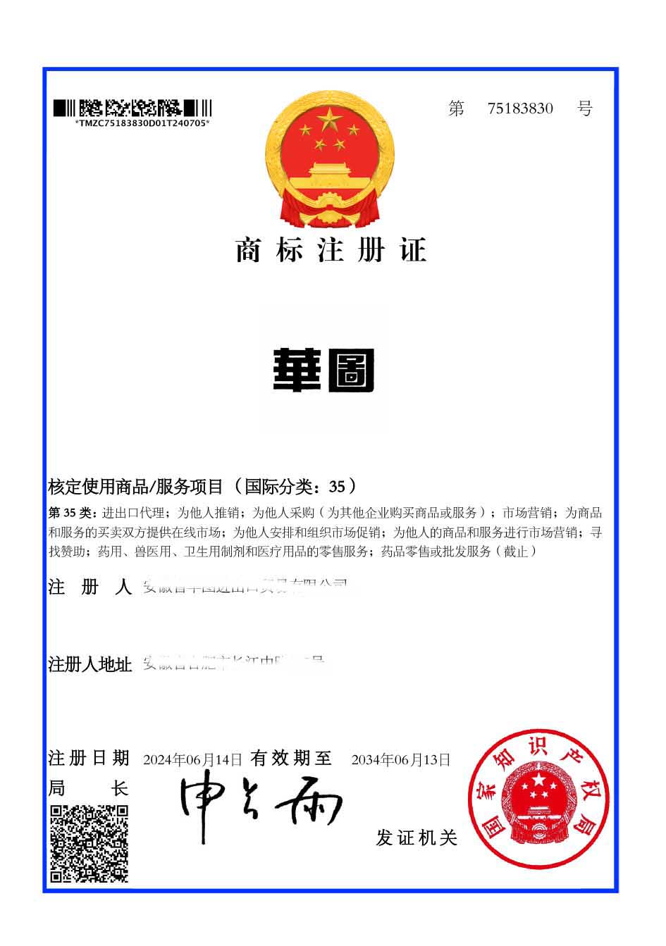 第35类“崋圖”商标注册证