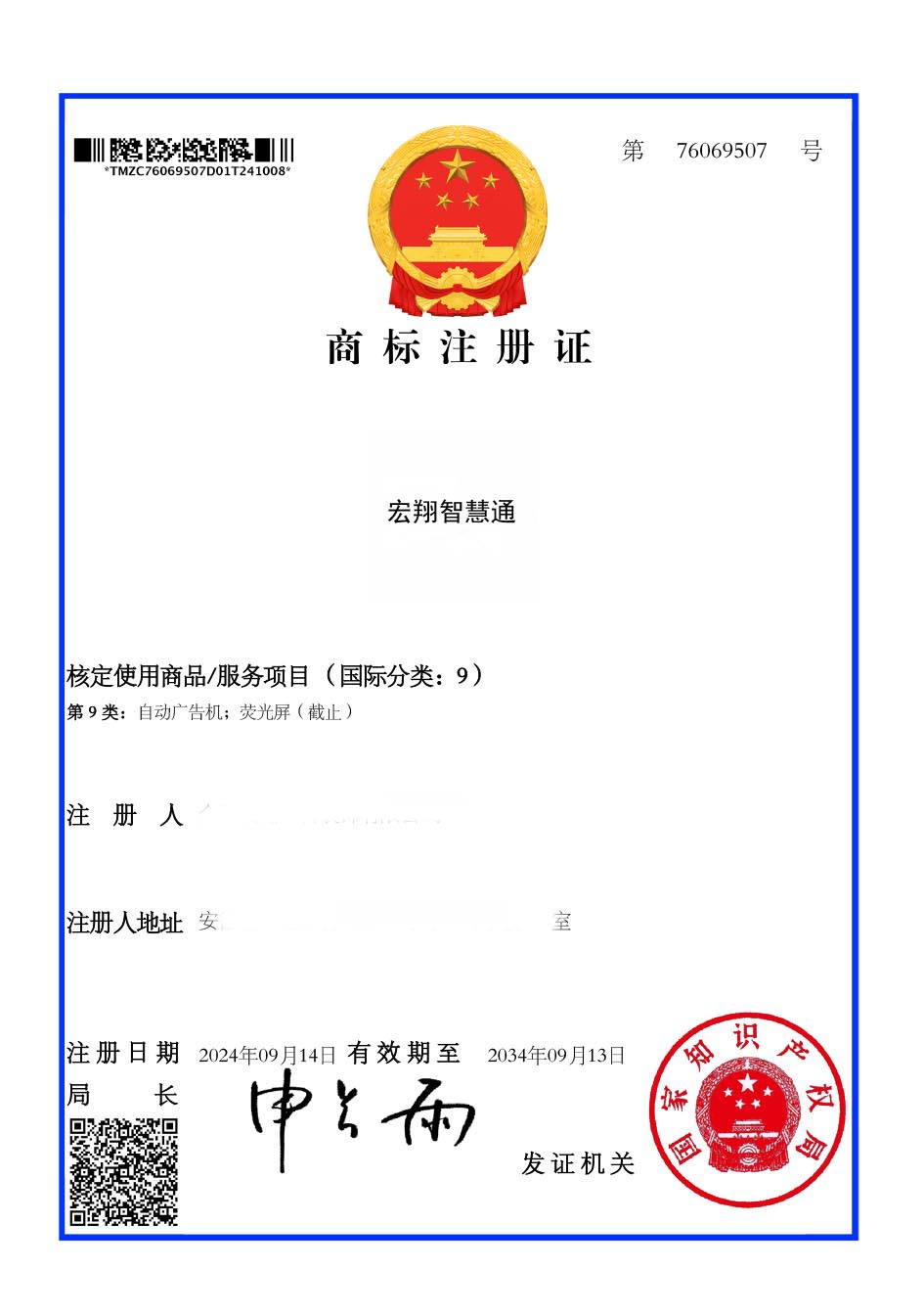 第9类“宏翔智慧通”商标注册证