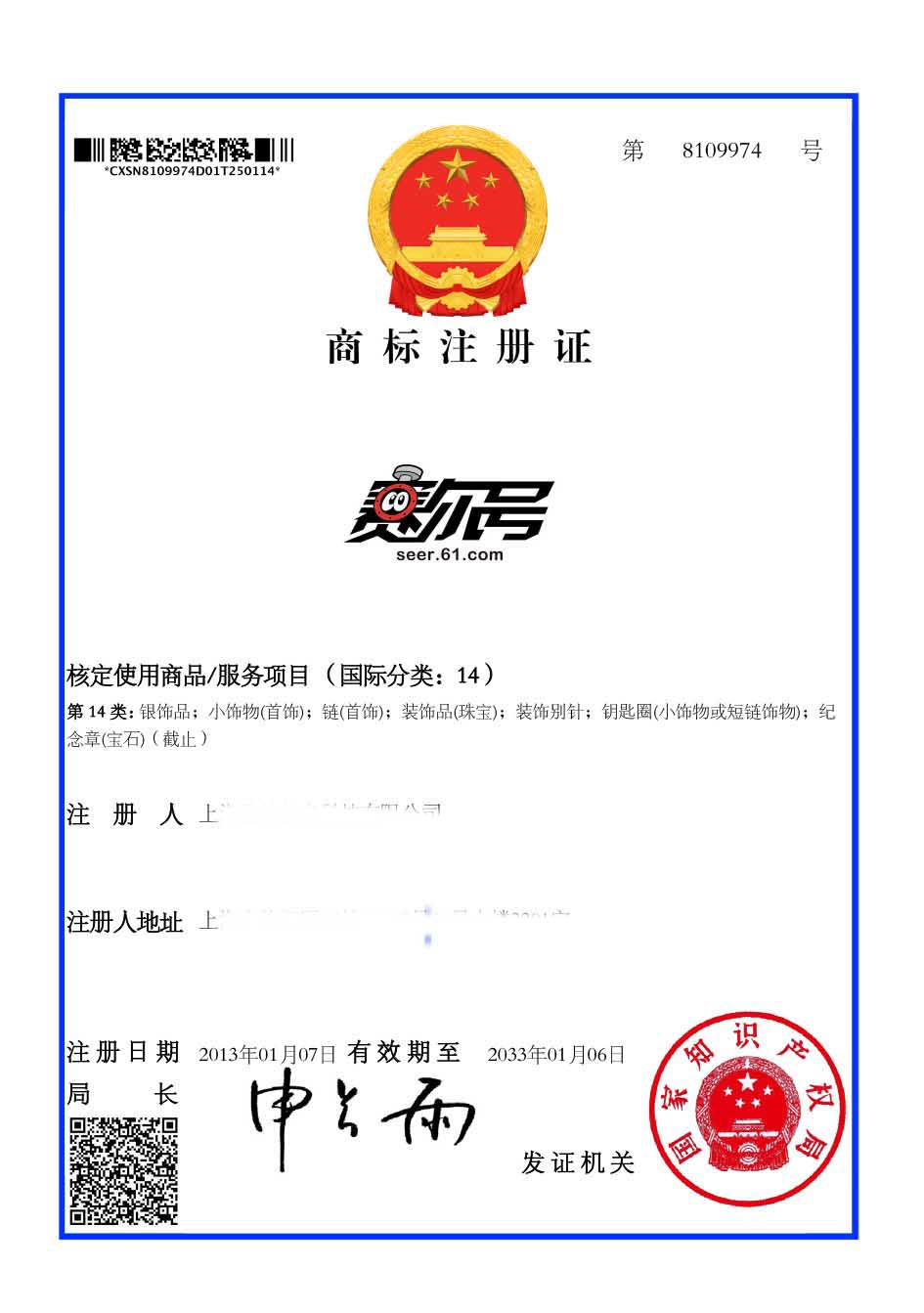 第14类“赛尔号 SEER.61.COM”商标注册证