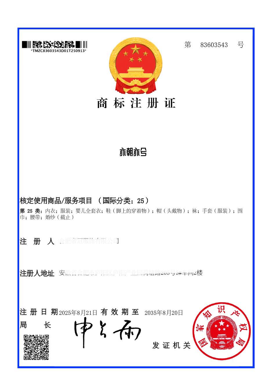 第25类“亦朝亦兮”商标注册证