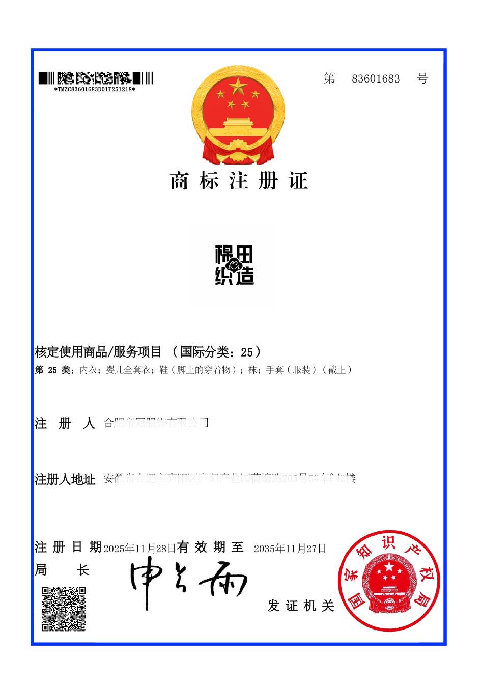 第25类“棉田织造”商标注册证