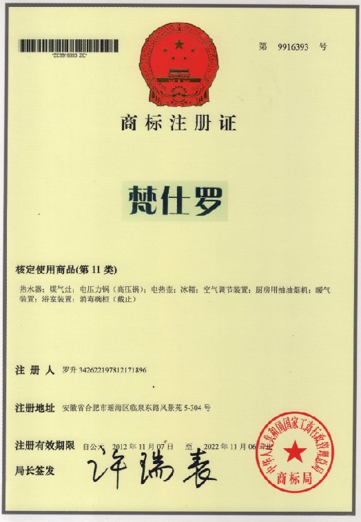 第11类“梵仕罗”商标注册证