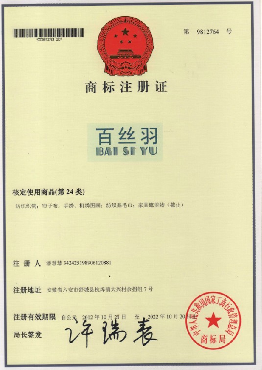 第24类“百丝羽及拼音”商标注册证