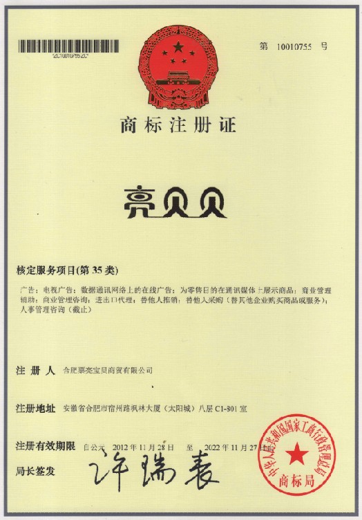 第35类“亮贝贝”商标注册证
