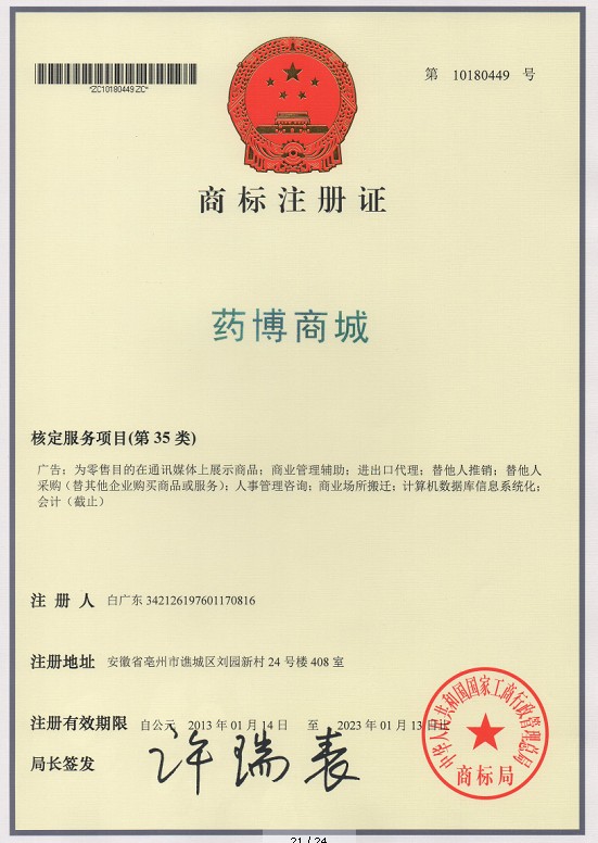 第35类“药博商城”的商标注册证
