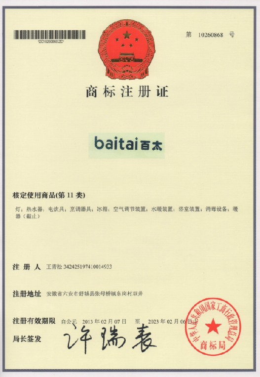 第11类“百太”baitai 商标注册证