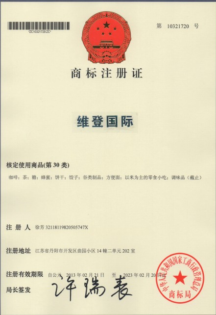 第30类“维登国际”商标注册证