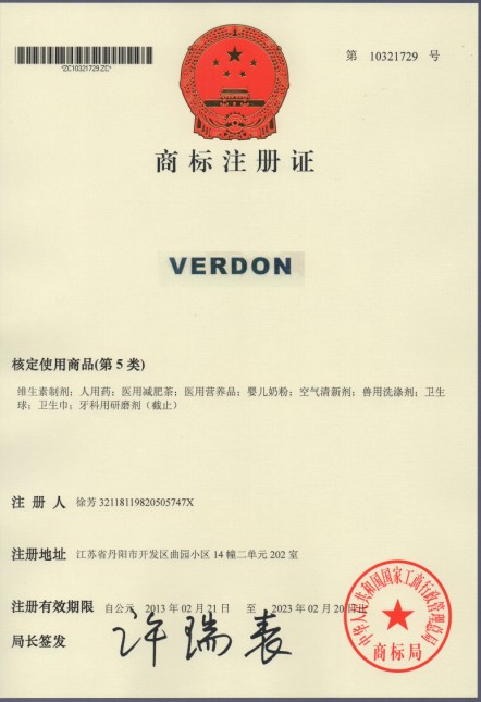第5类“VERDON”商标注册证