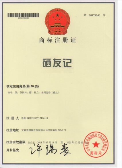 第30类“硒友记”商标注册证