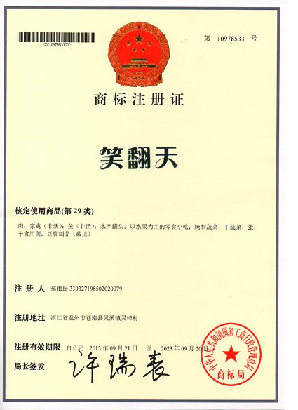 第29类“笑翻天”商标注册证