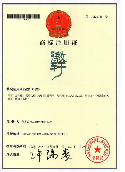 第33类“徽轩”商标注册证