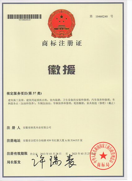 第37类“徽援”商标注册证