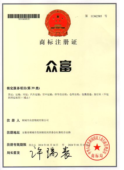 第39类“众富”商标注册证