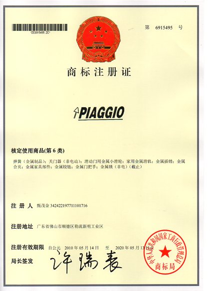 第06类“PIAGGIO”商标注册证