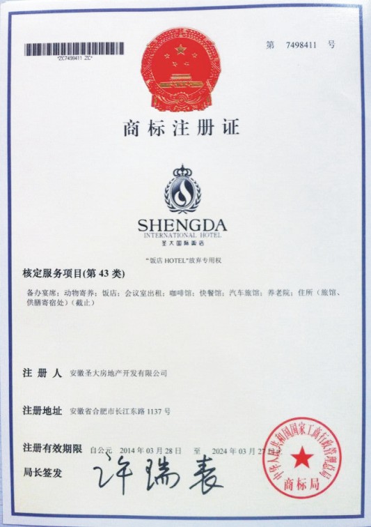 第43类“圣大国际饭店”商标注册证