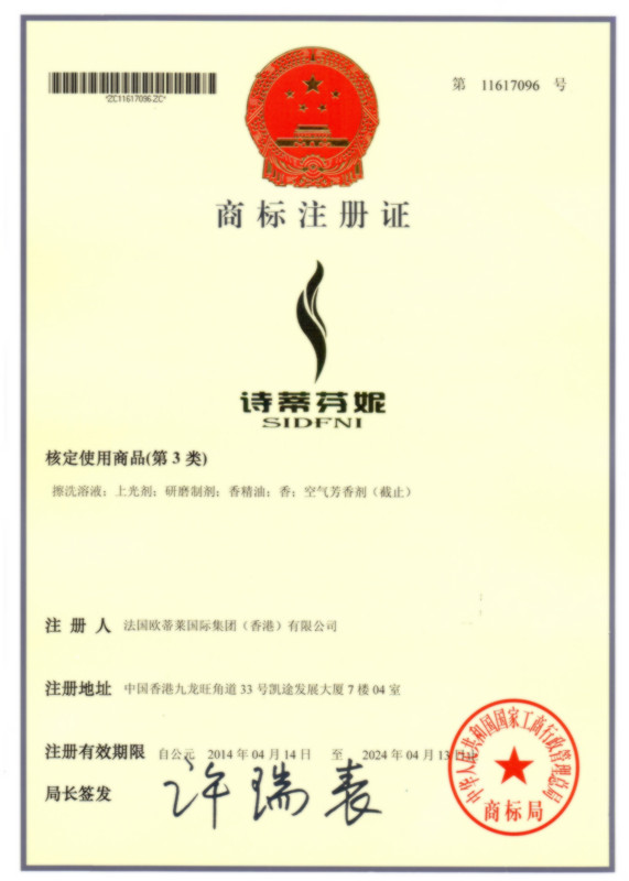 第3类“诗蒂芬妮SIDFNI及图形”商标注册证