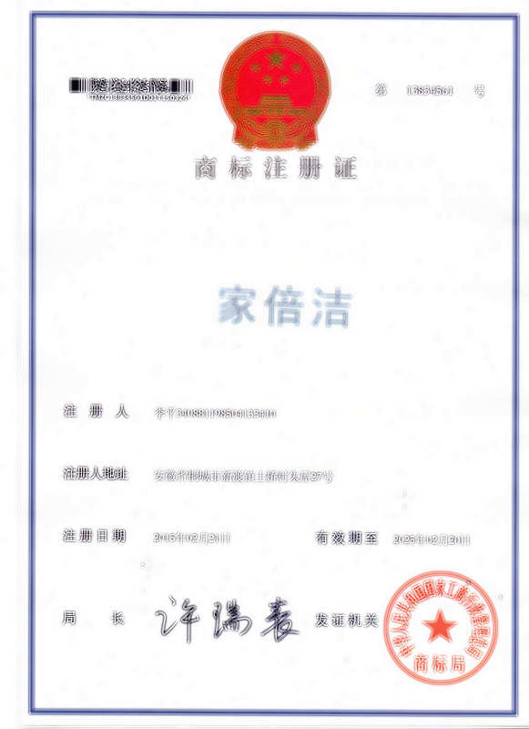 第16类“家倍洁”商标注册证