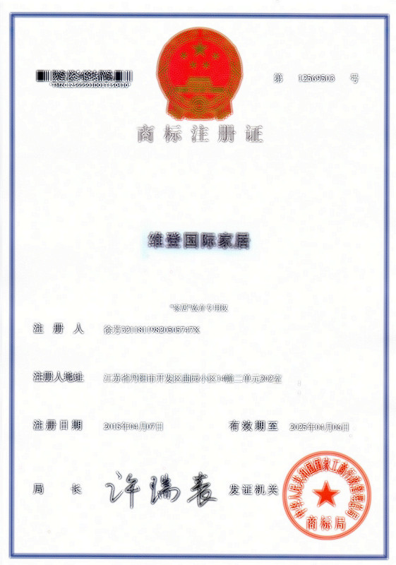 第43类“维登国际家居”商标注册证