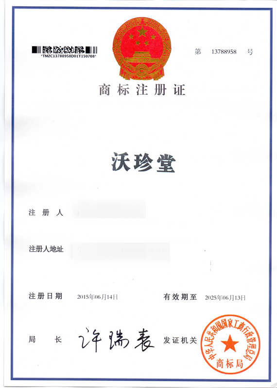 第5类“沃珍堂”商标注册证
