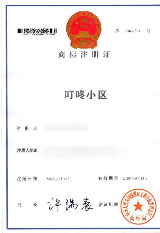 第45类“叮咚小区”商标注册证