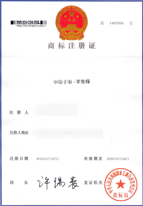 第35类“中隐于世 半生缘”商标注册证