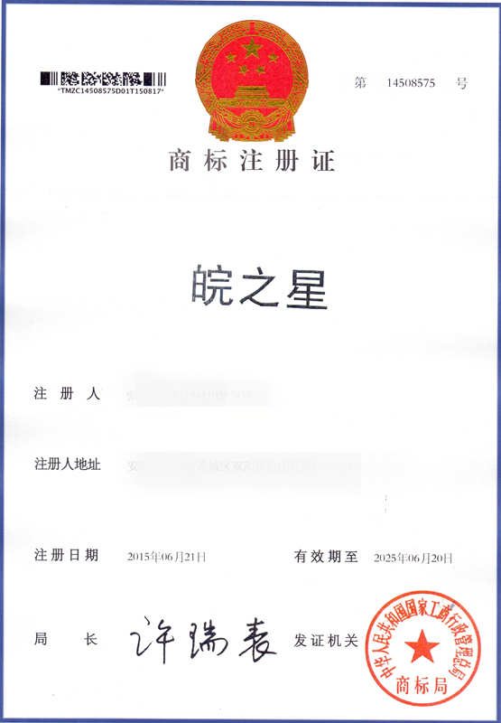 第7类“皖之星”商标注册证