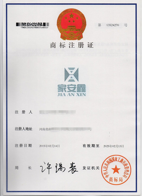 第35类“家安鑫”商标注册证