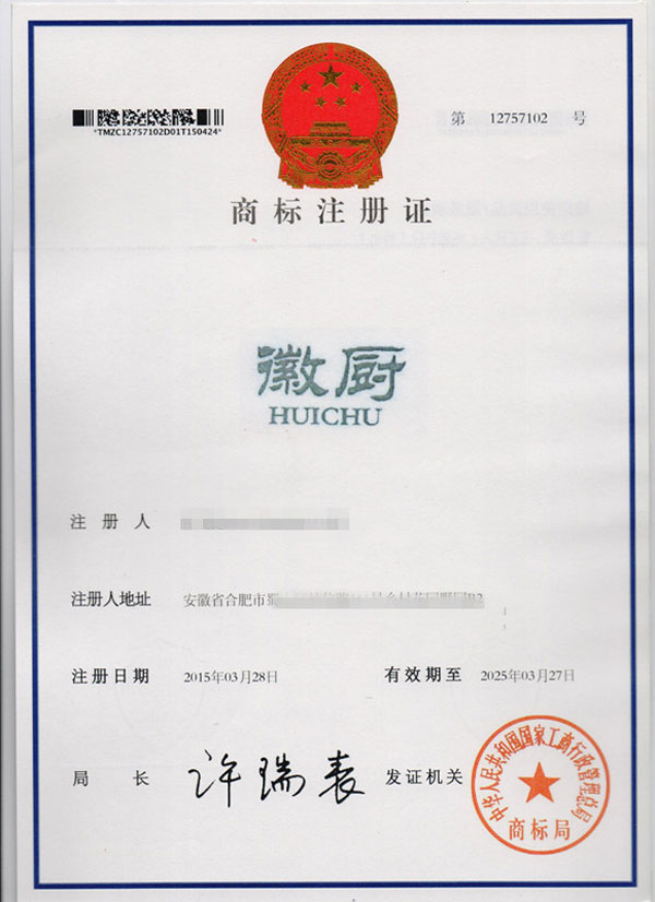 第29类“徽橱”商标注册证