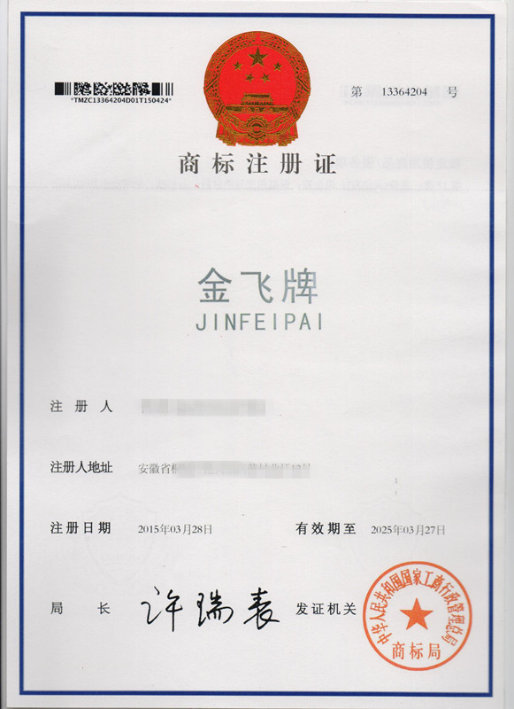 第17类“金飞牌 JINFEIPAI”商标注册证