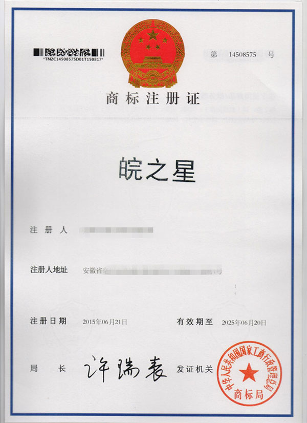 第7类“皖之星”商标注册证
