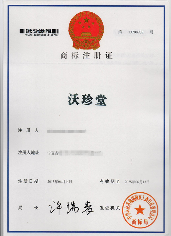 第5类“沃珍堂”商标注册证
