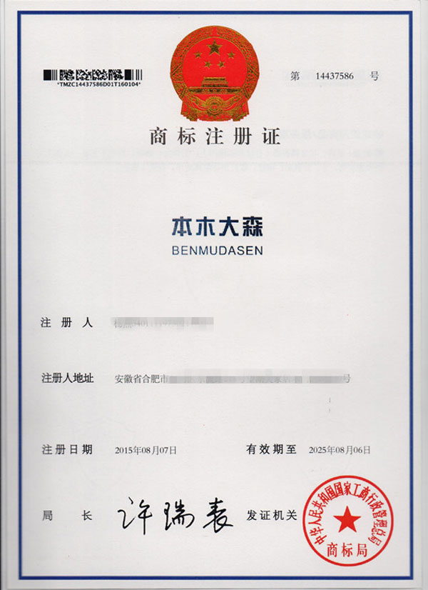 第20类“本木大森”商标注册证