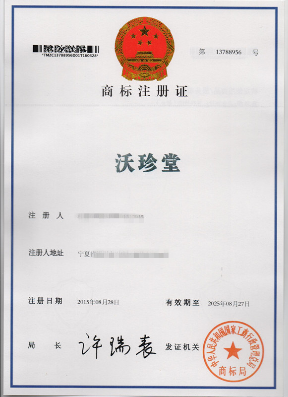 第35类“沃珍堂”商标注册证
