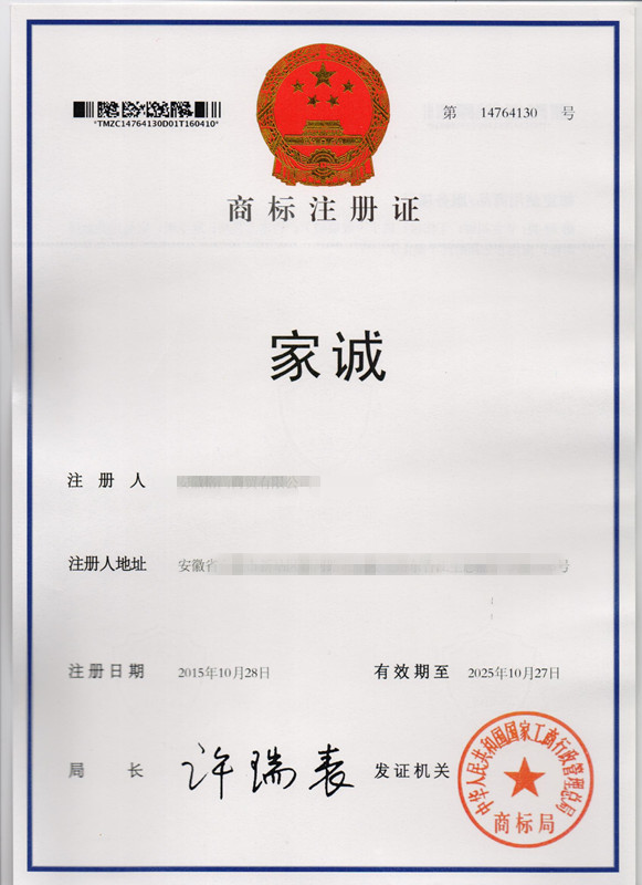 第20类“家诚”商标注册证