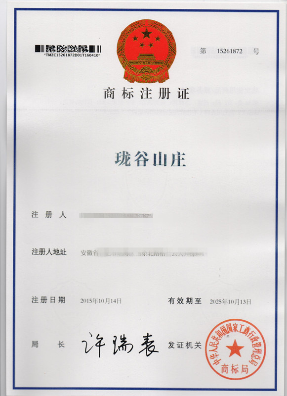 第30类“珑谷山庄”商标注册证
