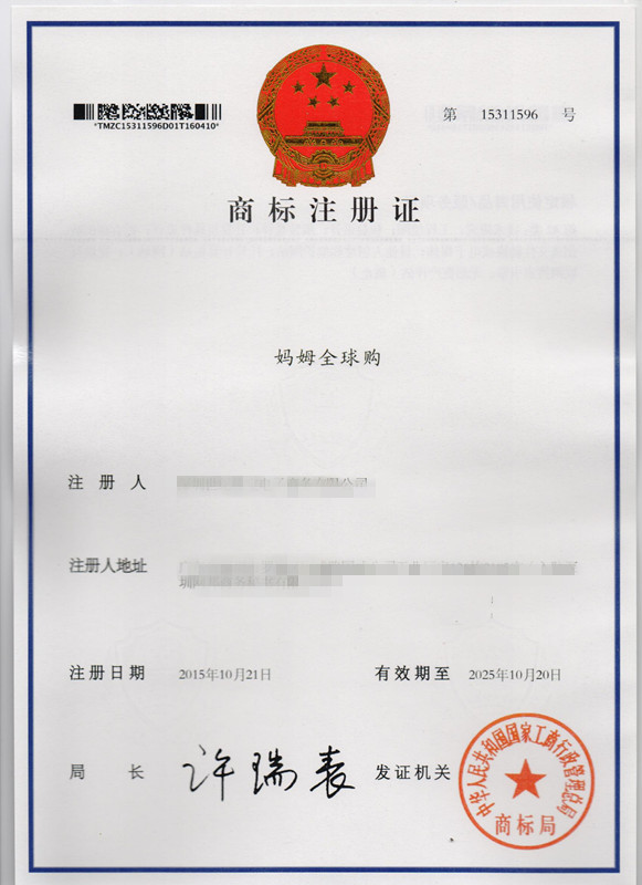 第42类“妈姆全球购”商标注册证
