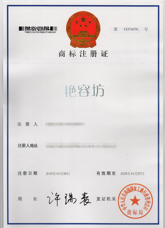 第25类“艳容坊”商标注册证