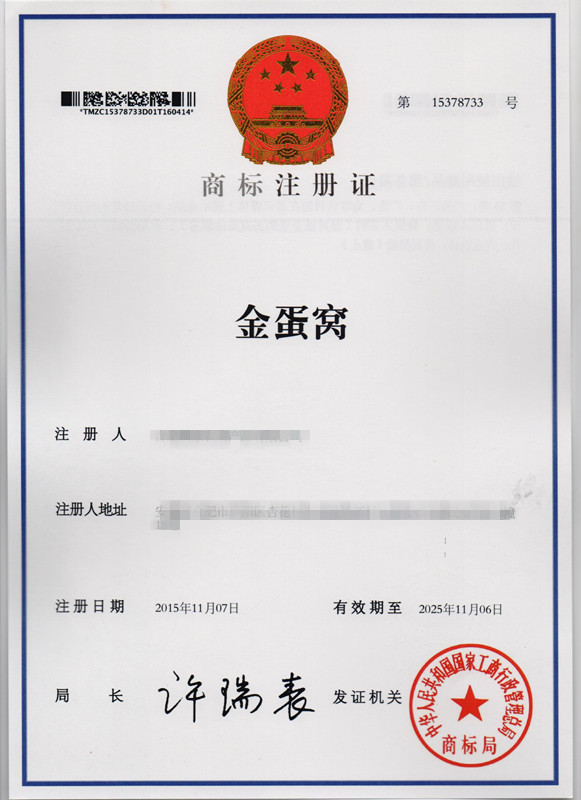 第35类”金蛋窝”商标注册证